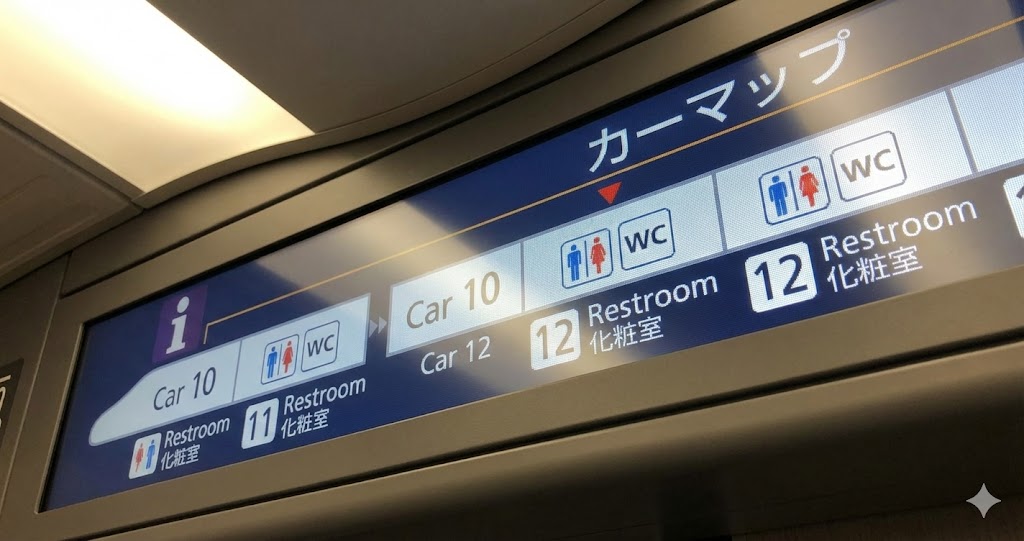 公式サイトや駅の案内で編成図を確認すれば、トイレの位置が一目で分かるようになっていますね。